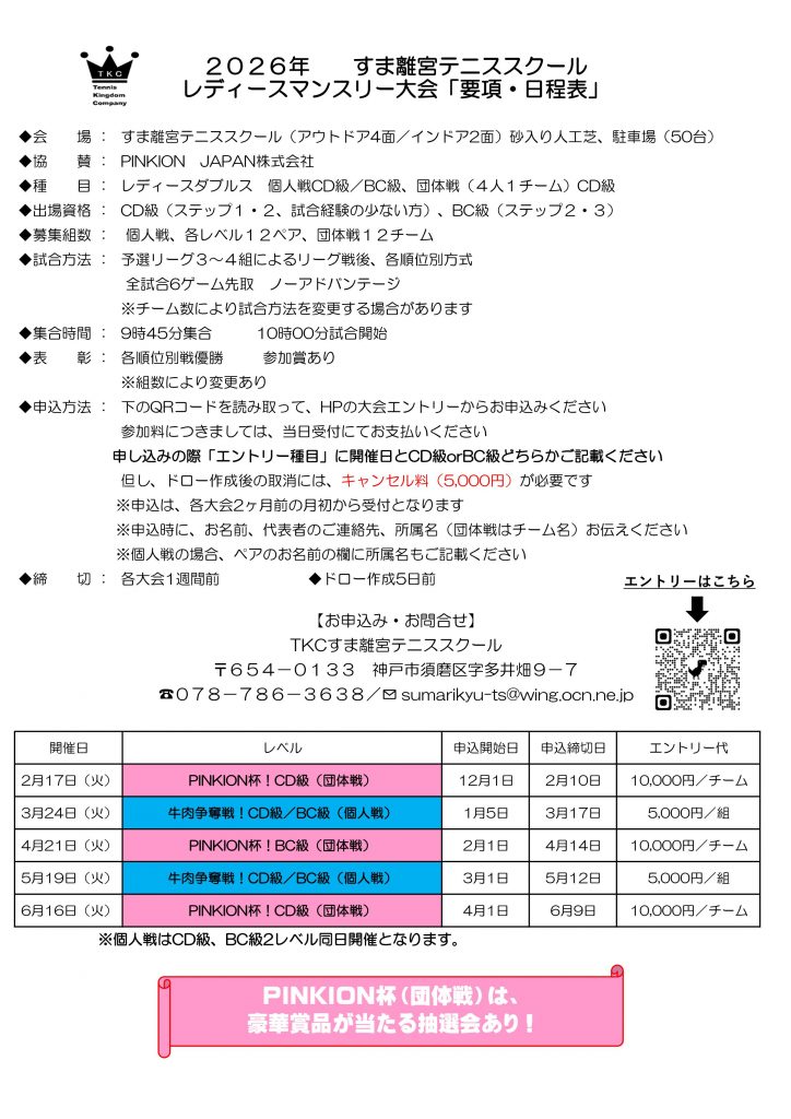 2026年上半期 すま離宮テニススクール レディースマンスリー大会の要綱がアップされました🎾 牛肉🍖争奪個人戦や、団体戦など、最低3試合保証や、コーチからのワンポイントアドバイスなど、毎回大人気イベントですので、お申込はお早めに✨ お申込は、QRコードを読み取り、HPの大会エントリーからお申込ください😊